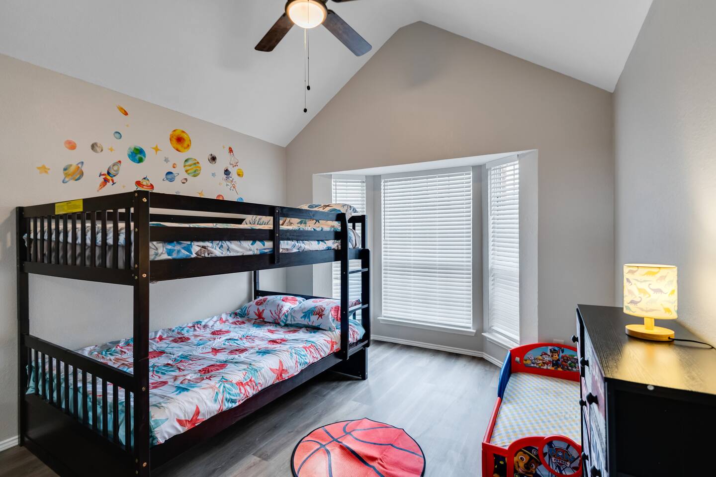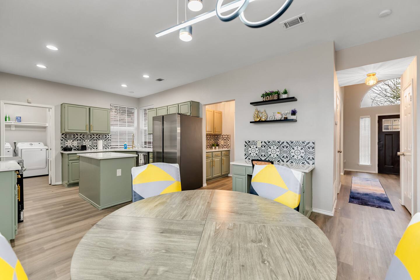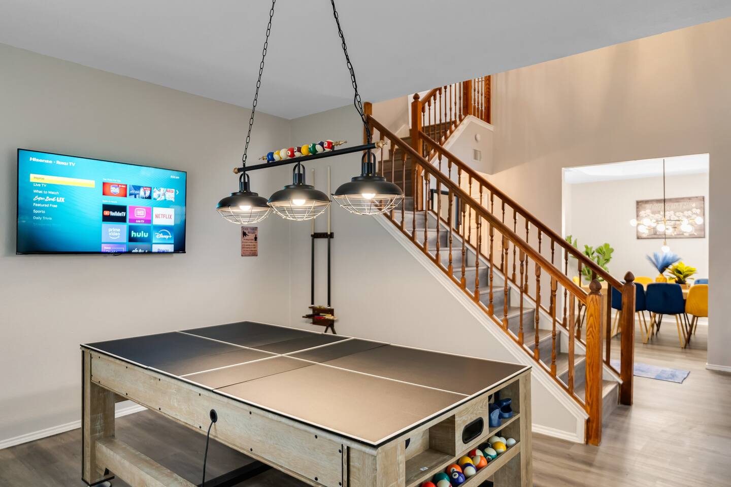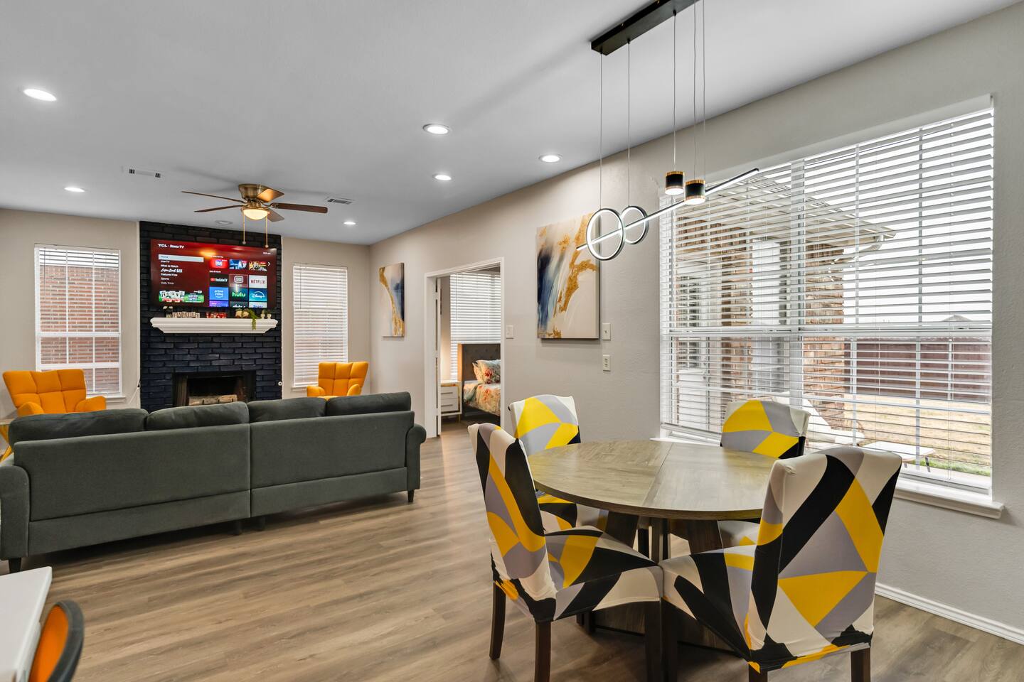 This newly remodeled, tastefully decorated 2-story home is perfect for friends and family gatherings. Featuring 5 bedrooms, 3 bathrooms, 2 dining areas, game room, fully equipped kitchen , it has everything you need for a relaxing and enjoyable stay. Bedrooms: 1st Floor: Queen-size bed, 2 nightstands, and a 50" Roku LED Smart TV. Sleeps 2. 2nd Floor: Bedroom 2: King-size bed, dresser, 2 nightstands, attached bathroom, walk-in closet, and a 65" LED Smart TV. Sleeps 2. Bedroom 3: King-size bed, dresser, 2 nightstands, closet, and a 50" LED Smart TV. Sleeps 2. Bedroom 4: Queen-size bed, dresser, 2 nightstands, closet, and a 50" LED Smart TV. Sleeps 2. Bedroom 5: Full-over-full bunk bed, 2 nightstands, dresser, and walk-in closet. Sleeps 4. Bathrooms: 1st Floor: Remodeled full bath with a stand-up shower. 2nd Floor: Master bathroom with a separate shower and tub. Additional bathroom with a shower/bath combo. Parking: Guests can park in the garage or in the driveway. Please note that the City of Rowlett prohibits short-term parking in front of the house. Laundry: Full access to the washer and dryer.