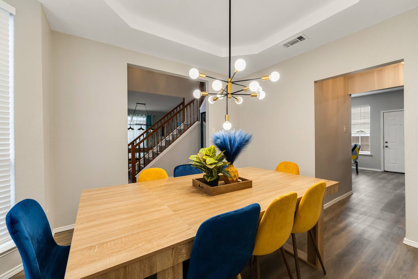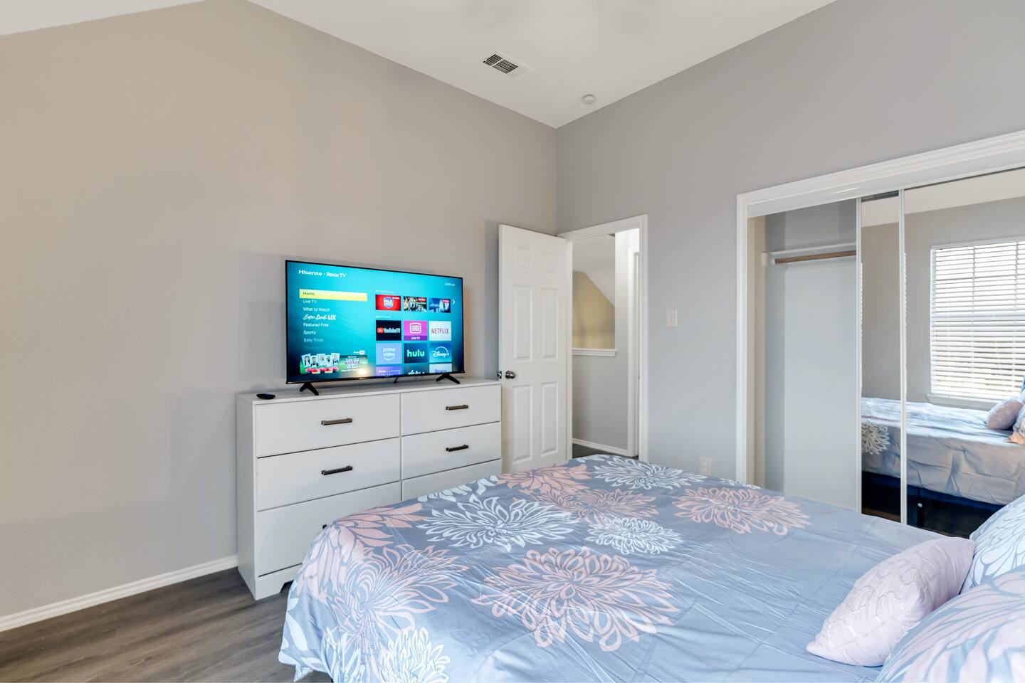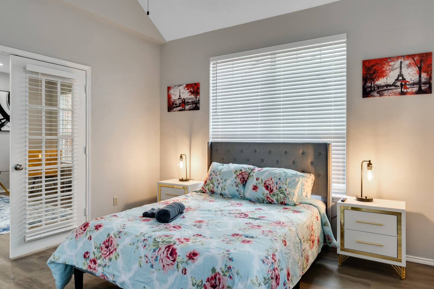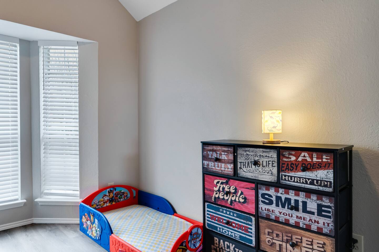 This newly remodeled, tastefully decorated 2-story home is perfect for friends and family gatherings. Featuring 5 bedrooms, 3 bathrooms, 2 dining areas, game room, fully equipped kitchen , it has everything you need for a relaxing and enjoyable stay. Bedrooms: 1st Floor: Queen-size bed, 2 nightstands, and a 50" Roku LED Smart TV. Sleeps 2. 2nd Floor: Bedroom 2: King-size bed, dresser, 2 nightstands, attached bathroom, walk-in closet, and a 65" LED Smart TV. Sleeps 2. Bedroom 3: King-size bed, dresser, 2 nightstands, closet, and a 50" LED Smart TV. Sleeps 2. Bedroom 4: Queen-size bed, dresser, 2 nightstands, closet, and a 50" LED Smart TV. Sleeps 2. Bedroom 5: Full-over-full bunk bed, 2 nightstands, dresser, and walk-in closet. Sleeps 4. Bathrooms: 1st Floor: Remodeled full bath with a stand-up shower. 2nd Floor: Master bathroom with a separate shower and tub. Additional bathroom with a shower/bath combo. Parking: Guests can park in the garage or in the driveway. Please note that the City of Rowlett prohibits short-term parking in front of the house. Laundry: Full access to the washer and dryer.