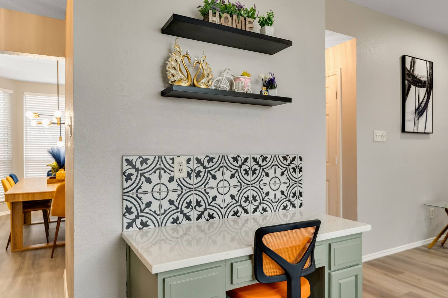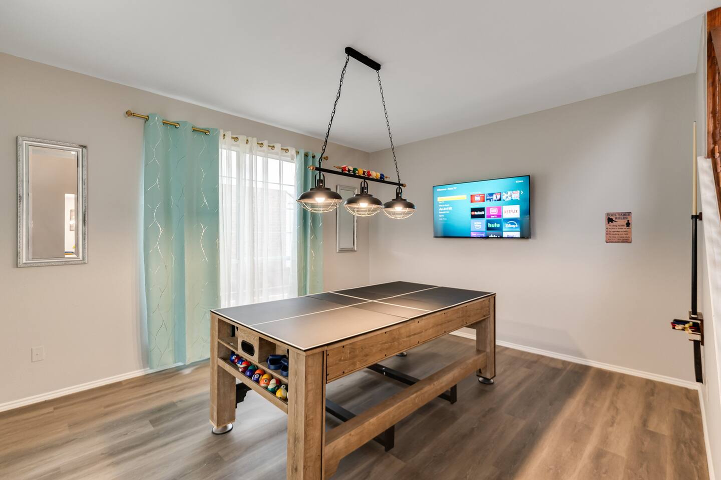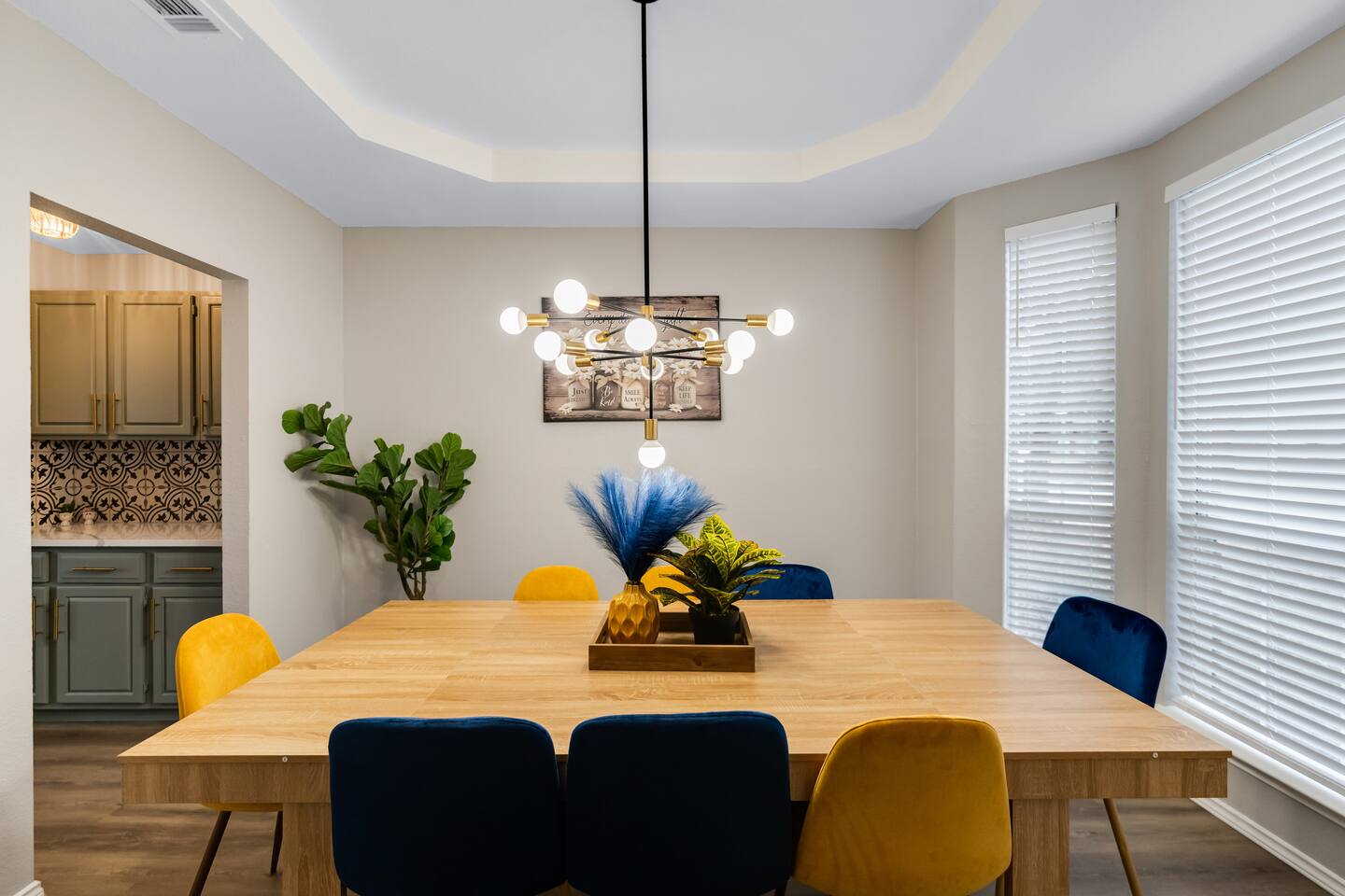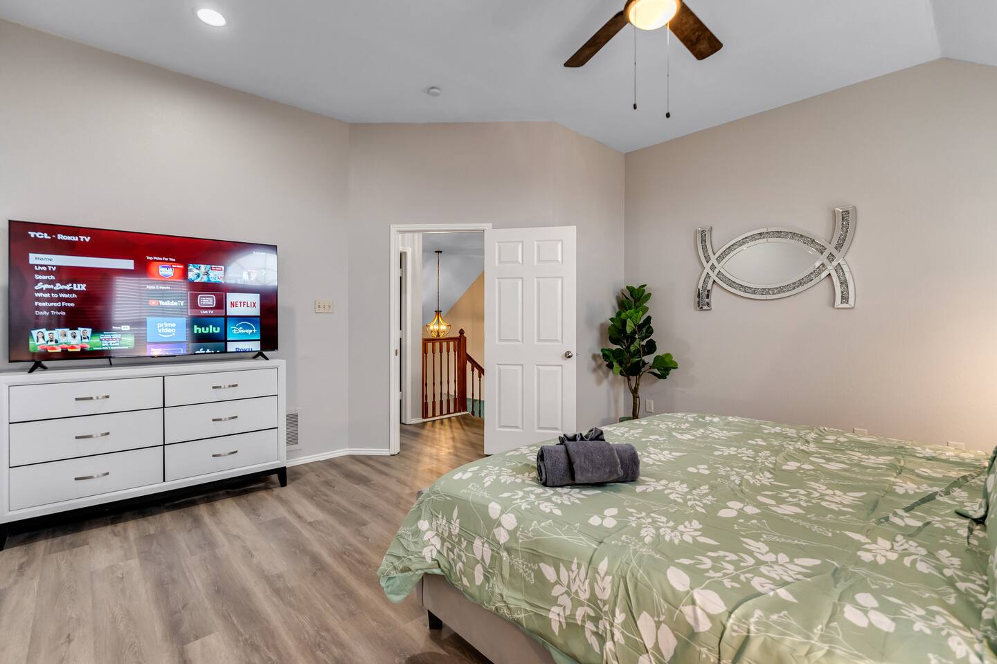 This newly remodeled, tastefully decorated 2-story home is perfect for friends and family gatherings. Featuring 5 bedrooms, 3 bathrooms, 2 dining areas, game room, fully equipped kitchen , it has everything you need for a relaxing and enjoyable stay. Bedrooms: 1st Floor: Queen-size bed, 2 nightstands, and a 50" Roku LED Smart TV. Sleeps 2. 2nd Floor: Bedroom 2: King-size bed, dresser, 2 nightstands, attached bathroom, walk-in closet, and a 65" LED Smart TV. Sleeps 2. Bedroom 3: King-size bed, dresser, 2 nightstands, closet, and a 50" LED Smart TV. Sleeps 2. Bedroom 4: Queen-size bed, dresser, 2 nightstands, closet, and a 50" LED Smart TV. Sleeps 2. Bedroom 5: Full-over-full bunk bed, 2 nightstands, dresser, and walk-in closet. Sleeps 4. Bathrooms: 1st Floor: Remodeled full bath with a stand-up shower. 2nd Floor: Master bathroom with a separate shower and tub. Additional bathroom with a shower/bath combo. Parking: Guests can park in the garage or in the driveway. Please note that the City of Rowlett prohibits short-term parking in front of the house. Laundry: Full access to the washer and dryer.