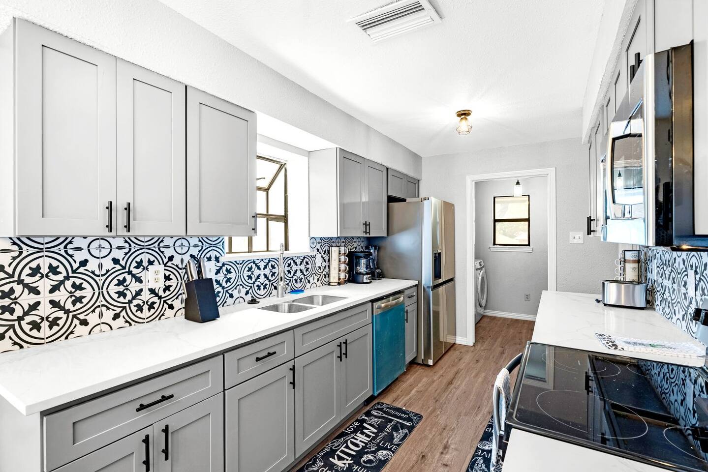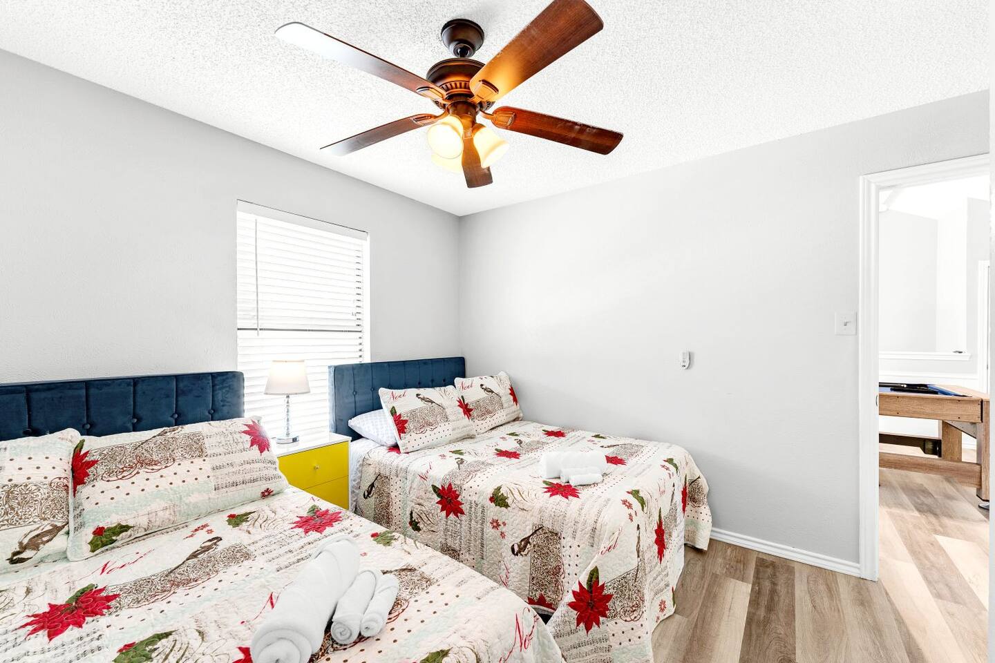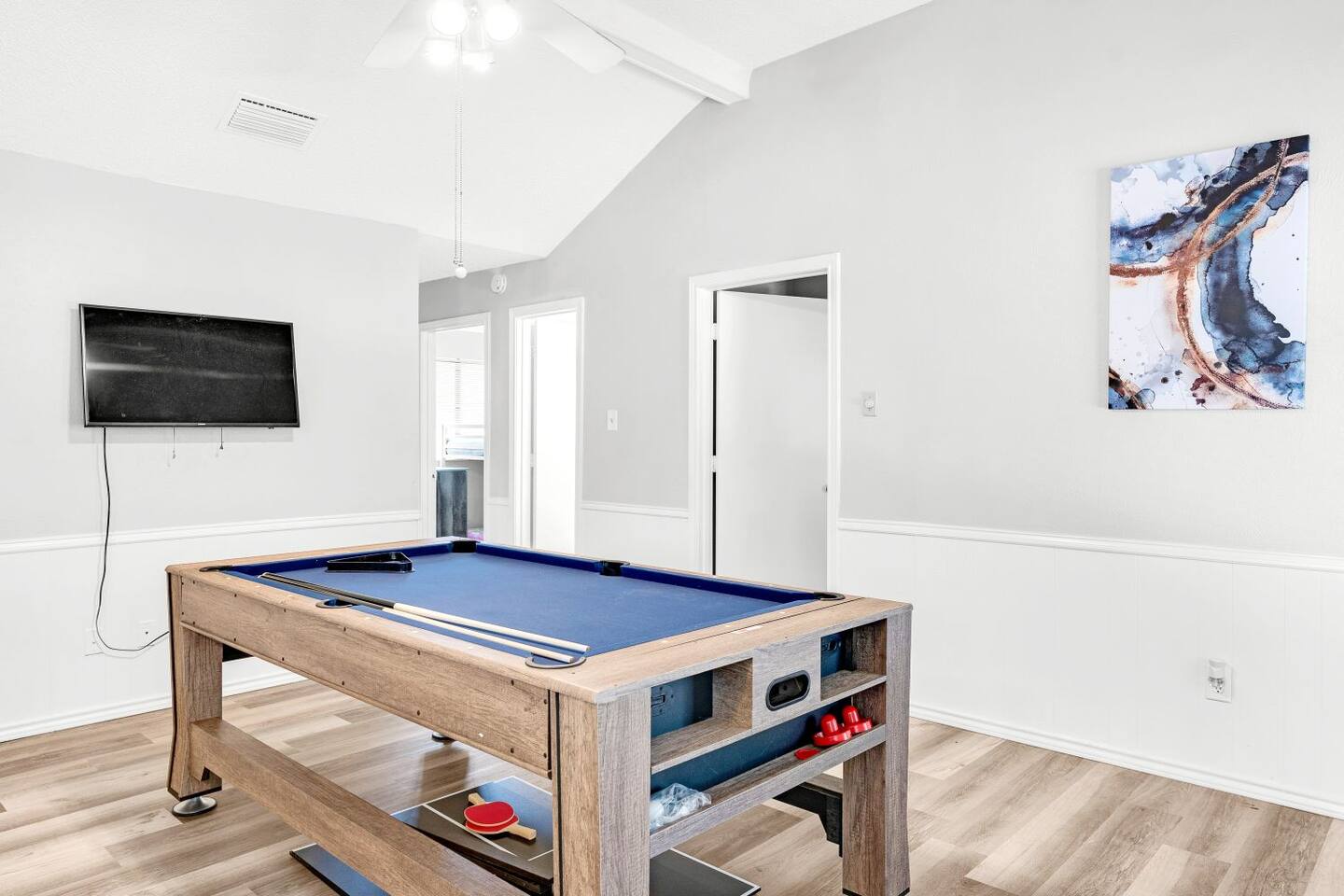 This completely remodeled, tastefully decorated, 2 story fabulous home, features 4 bedrooms, 2.5 bathrooms, 2 dinning areas, 1 living room, 1 game room with Pool Table/ Pingpong/ Air Hockey is perfect for friends and family gatherings. Downstairs Master bedroom with king-size bed, dresser, chest of drawers, night stands and attached bathroom and a large walk-in Closet, 60" Roku LED smart TV Upstairs 2nd bedroom with two full beds, night stand, walk in closet 3rd bedroom with Queen size bed, dresser, night stand, walk-in closet 4th bedroom with queen size bed, night stand, chest of drawers, walk-in closet Bathrooms 1st floor: New Master bathroom has separate frameless shower and free standing bath tub. New Half bath 2nd floor: Completely upgraded full bath and shower combo. Parking: No street parking for short-term guests (less than 30 days). Parking is available in back driveway or garage. Laundry: Guest have full access to the washer and dryer