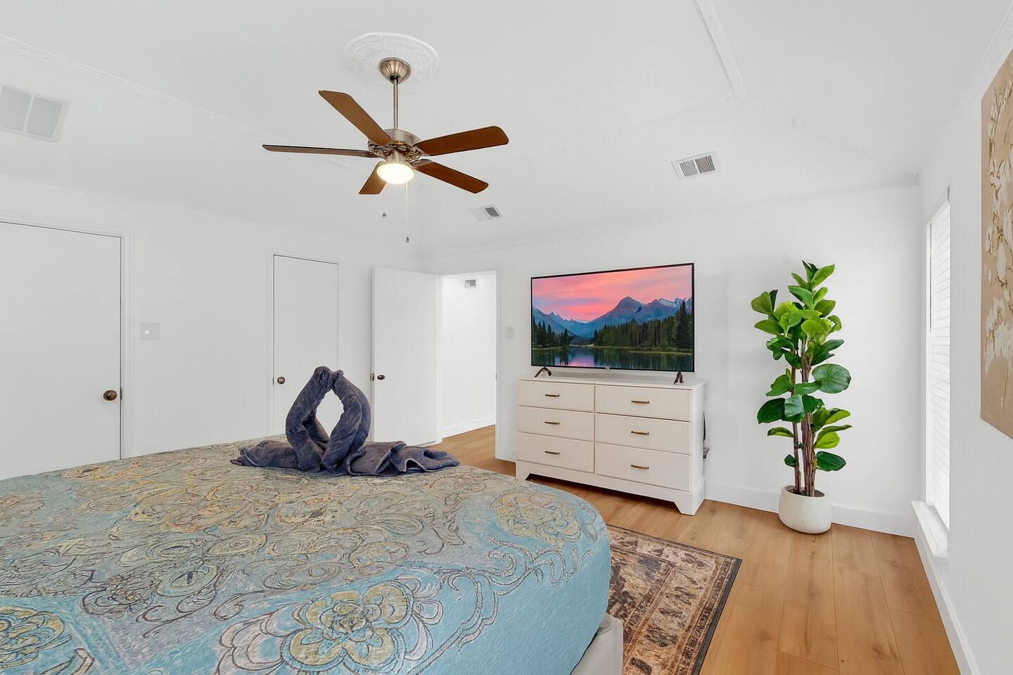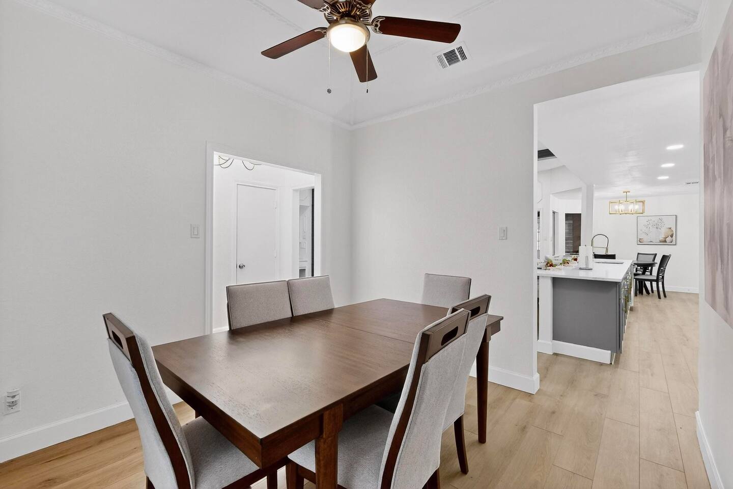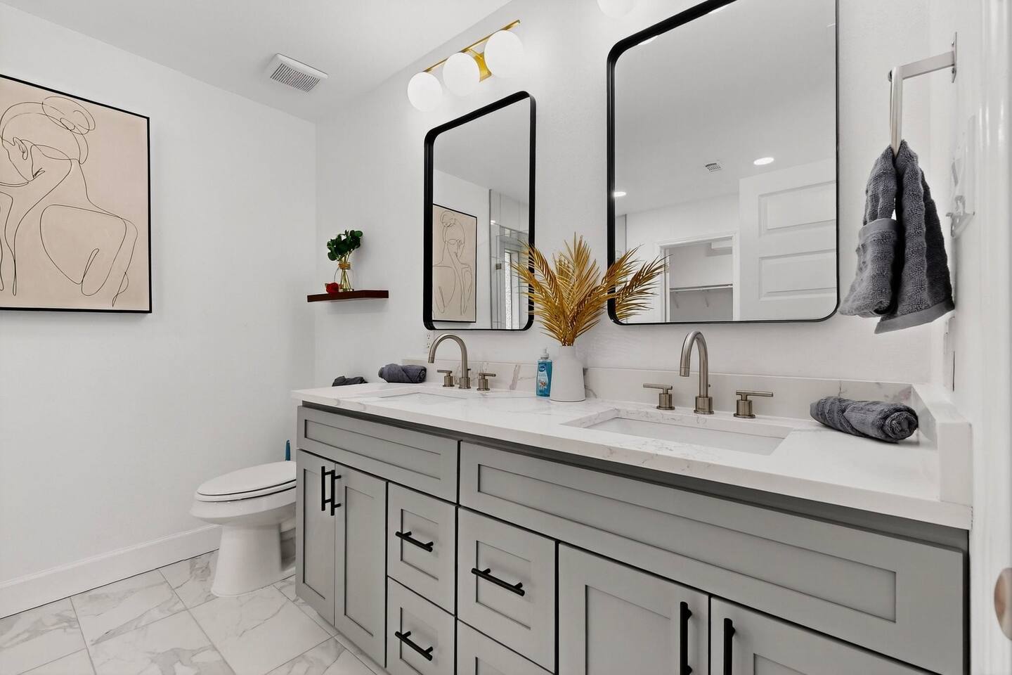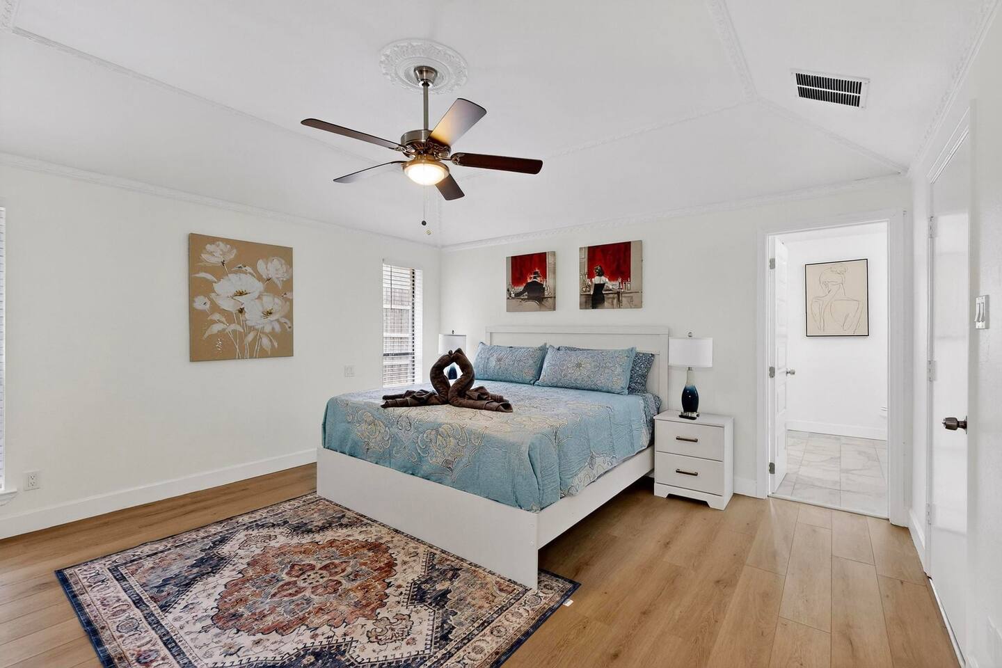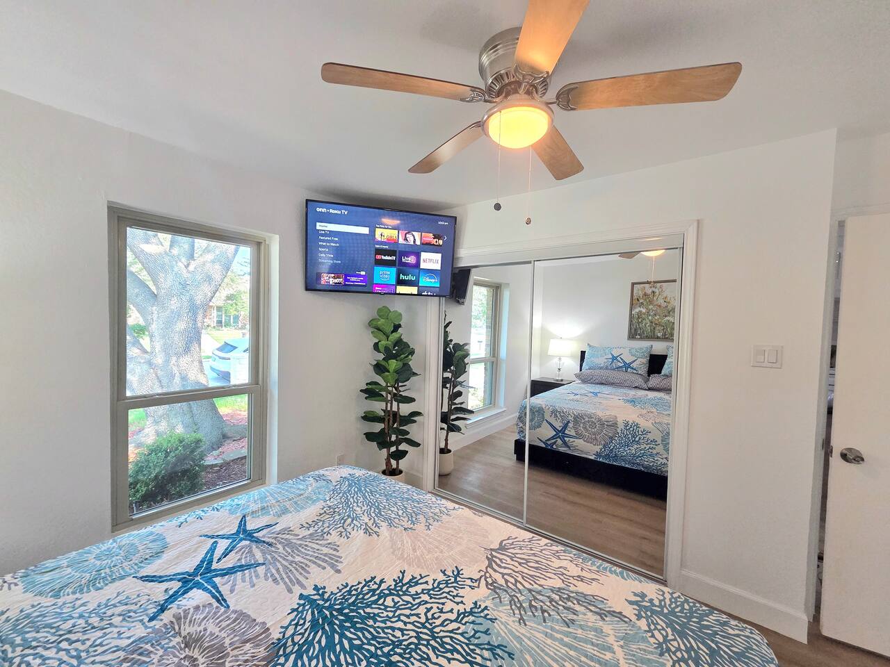 Accommodations: The first master bedroom features a plush king-size bed, dressers, nightstands, and an attached bathroom with walk-in closet with ensuite bathroom. Enjoy entertainment on the 65" smart TV. The second master bedroom offers a comfortable king-size bed, nightstands, and a walk-in closet with ensuite bathroom. Enjoy a big 55" smart TV. In the third bedroom, you'll find two full-size beds, nightstands, dresser, ensuite bathroom and walk-in closet. The fourth bedroom includes a queen bed, nightstand, dresser, and a walk-in closet. Bathrooms: The home features three upgraded full bathrooms on the first floor, including two ensuite master baths, as well as an upgraded half bathroom conveniently located next to the laundry room. Parking: Guests can utilize parking spaces in the garage, in front of the house, and in the driveway, ensuring hassle-free arrivals and departures. Laundry: Guests have full access to the washer and dryer, making laundry tasks simple and convenient throughout their stay. Highlights: Modern Amenities: Fully equipped kitchen, high-speed WiFi, smart TV with streaming services. Outdoor Space: Relax in our private backyard with a patio and barbecue grill. Workspace: Dedicated workspace ideal for remote work or study. Nearby Attractions: Just minutes away, you’ll find the vibrant Carrollton Koreatown with endless dining and dessert options, the charming A.W. Perry Homestead Museum, and peaceful Carrollton Greenbelt Park for a nature escape. For golfers, Indian Creek Golf Club is close by, while outdoor lovers can explore trails at Arbor Hills Nature Preserve or Cottonwood Trail. Families and day-trippers will also enjoy easy drives to the Dallas Arboretum, Oak Point Park, and the Heard Natural Science Museum. Whether you’re here for food, culture, shopping, or the outdoors, our location makes it easy to experience the best of North Dallas. Ideal For: Business travelers seeking a quiet retreat with quick access to corporate offices. Families or groups looking for a comfortable base to explore Plano and beyond. Additional Information: Self-check-in with keypad entry. Free parking. Experience Plano like a local at our inviting home. Book your stay now and enjoy a perfect blend of convenience and comfort!