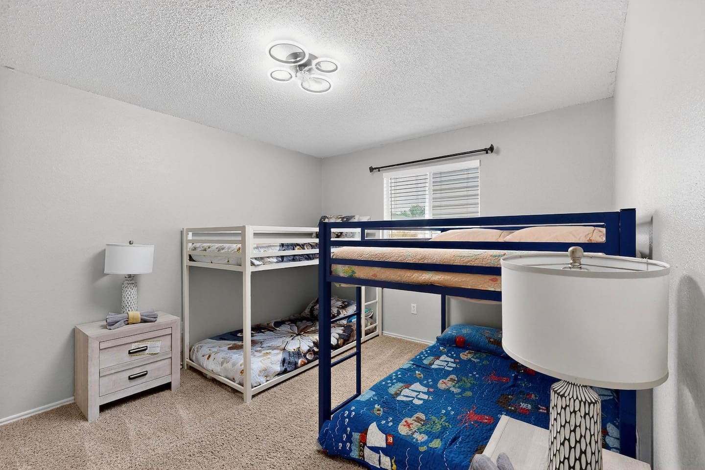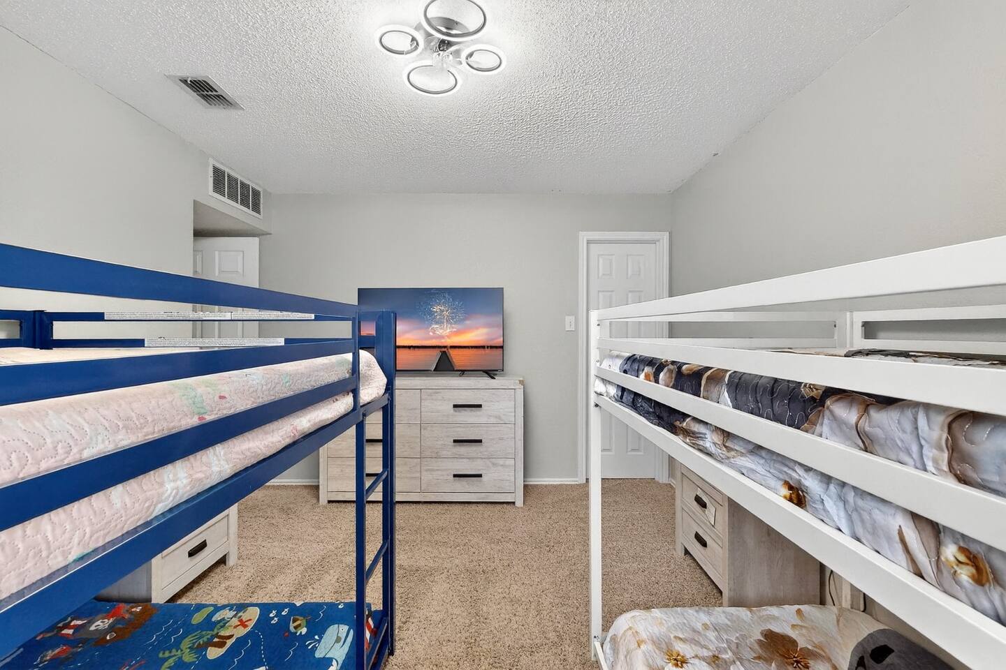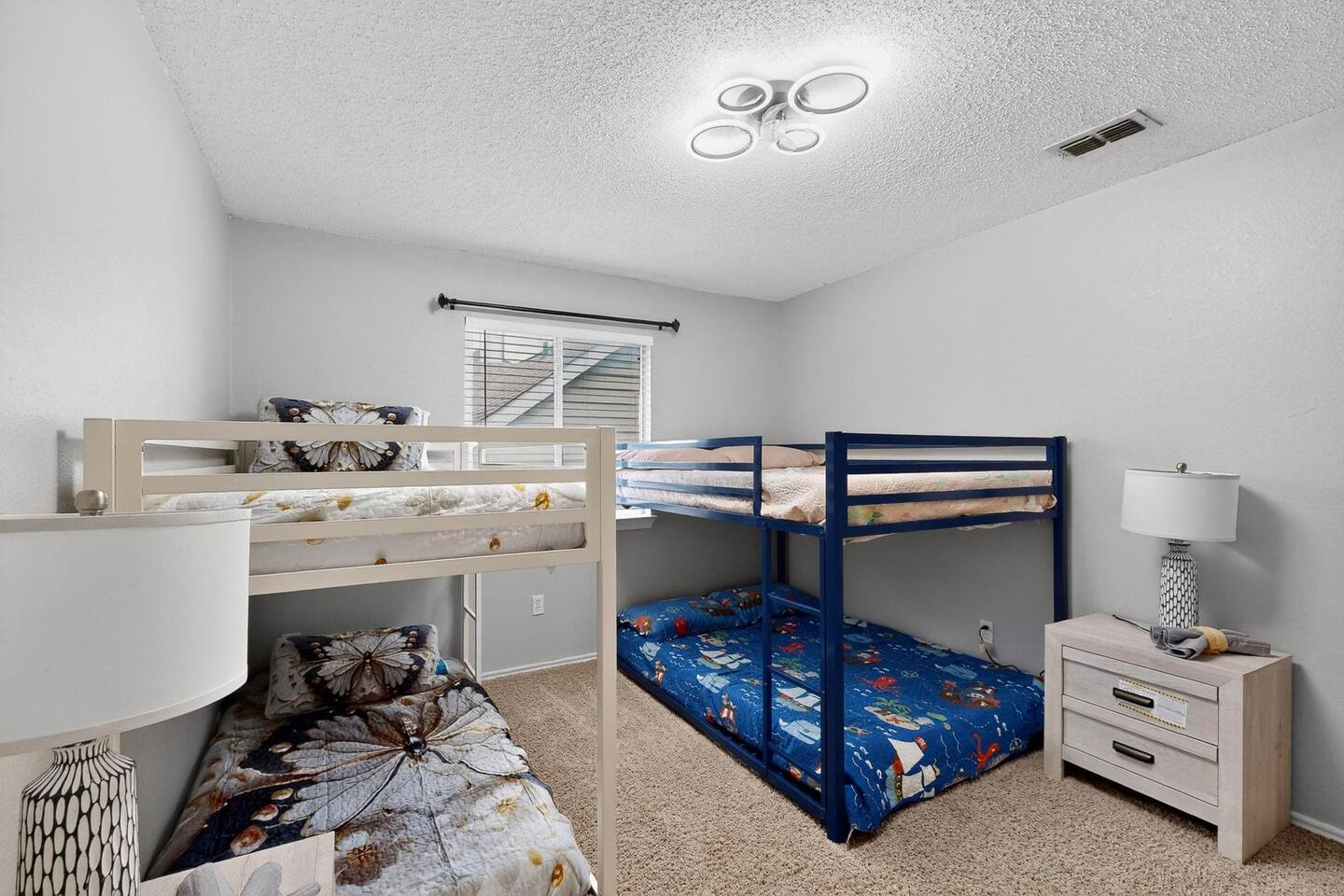 Bedrooms 1st floor: One bedroom with 2 full beds, computer desk, night stand, 55" Roku LED smart TV, sleep 4 2nd floor: Primary bedroom with king-size bed, dresser, night stands and attached bathroom and walk-in Closet, 65" Roku LED smart TV, sleep 2 3rd bedroom with Queen-size bed, dresser, night stands, closet, 50" YouTube TV, sleep 2 4th bedroom with King size bed, TV stand, night stands, walk-in closet, sleep 2 5th bedroom with full-over full bunk bed, a twin over twin bunk bed, dresser & night stands, walk-in closet, sleep 6 Bathrooms 1st floor: A half bath with a vanity and toilet 2nd floor: Beautifully remodeled master bathroom with separate bath and shower 1 upgraded full bath and shower combo. Parking: Guests can park in front of the house and the rear driveway. Laundry: Guest have full access to the washer and dryer Pool: Pool operates from May to October when weather permits. Pool hours: 10am to 10pm.