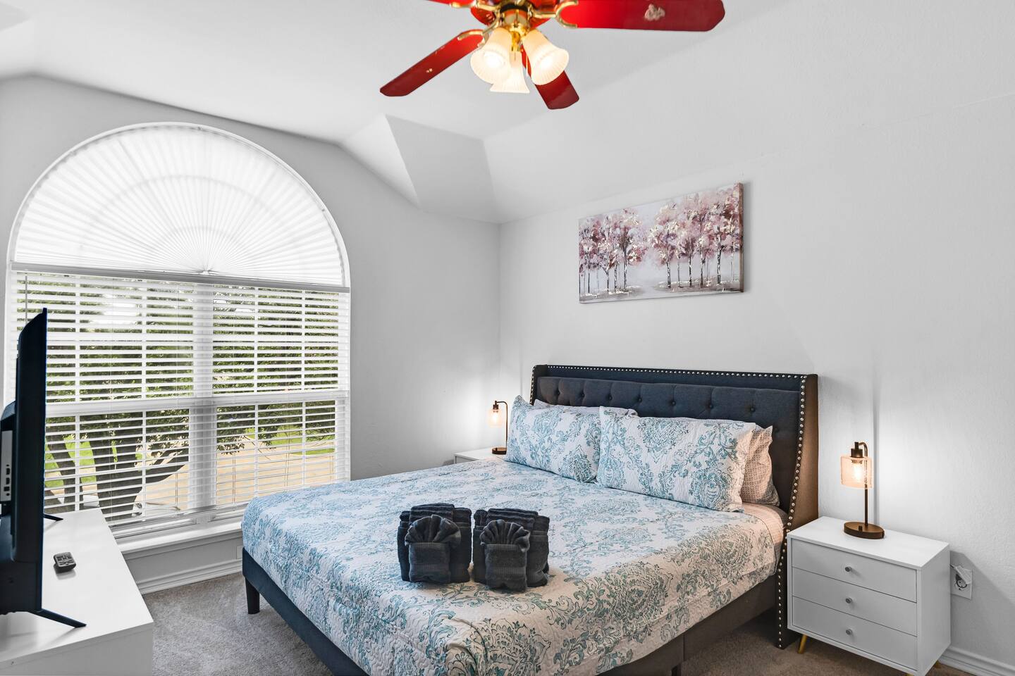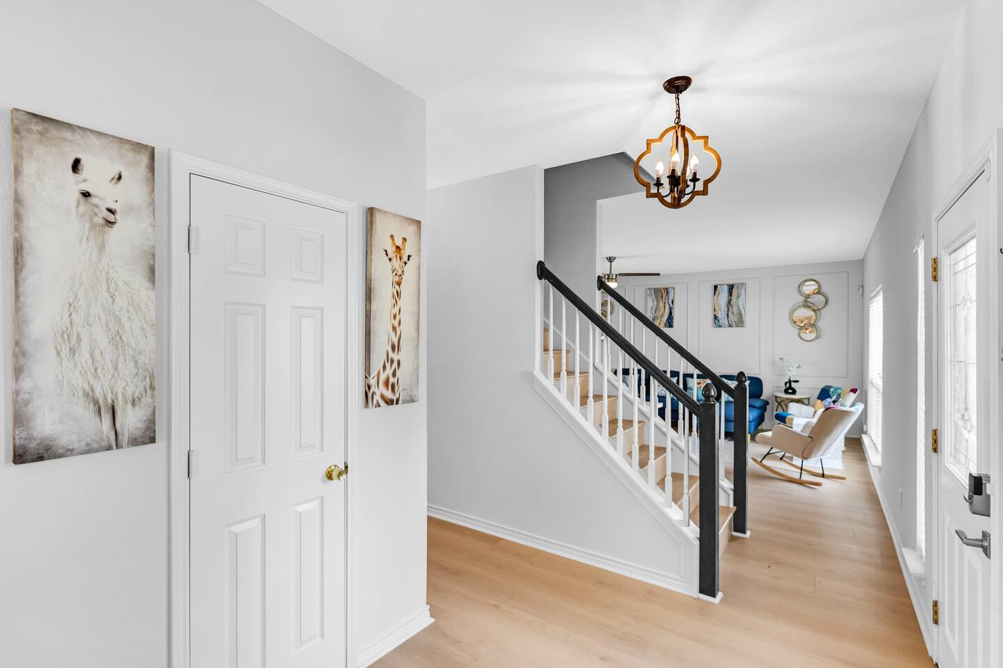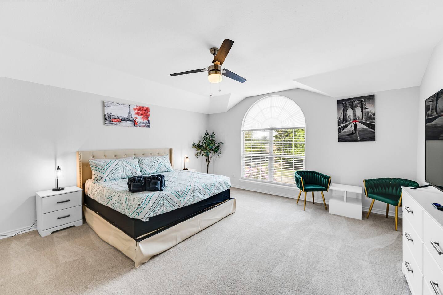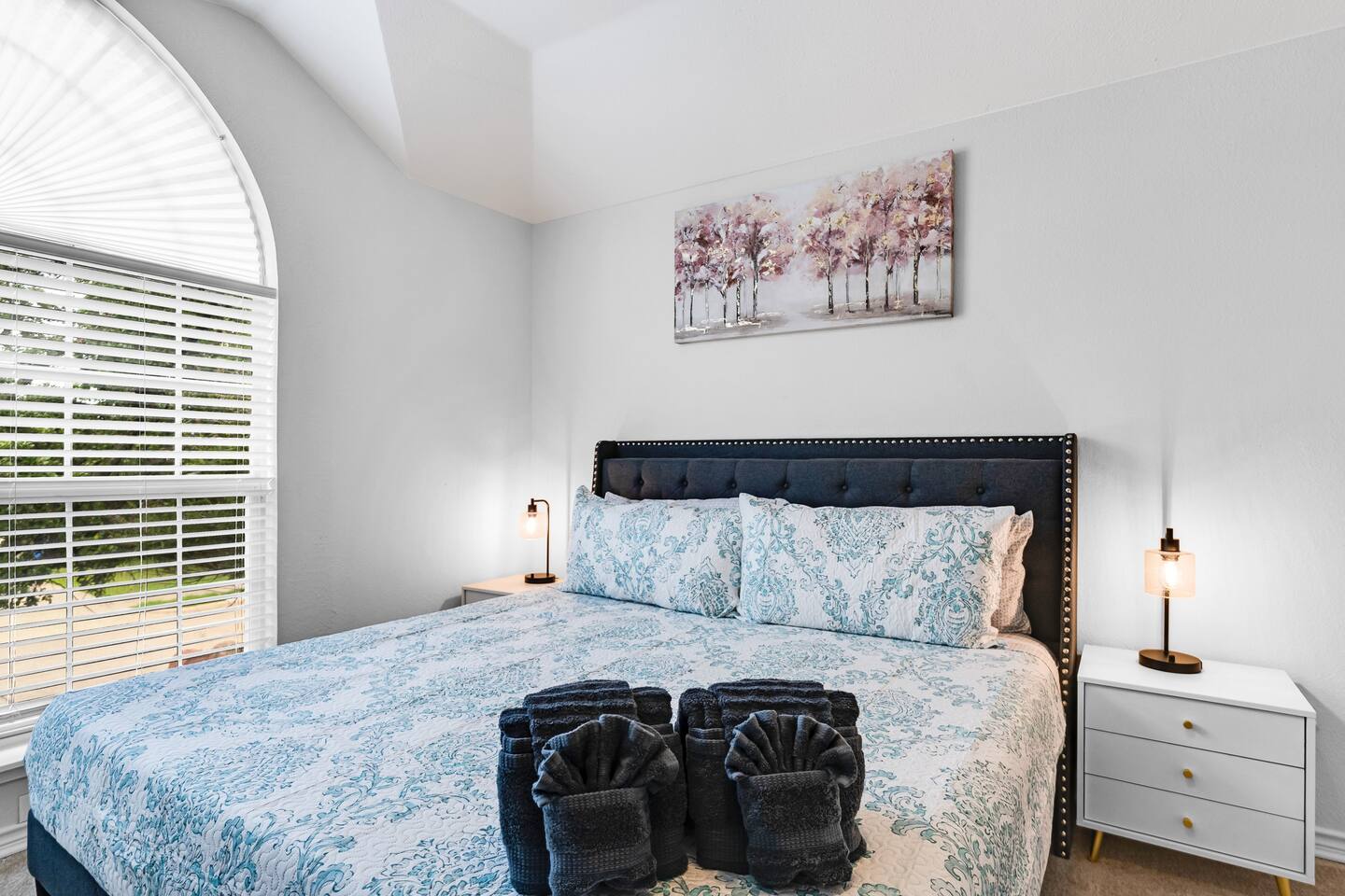 This spacious, tastefully decorated, 2 story fabulous home, features 5 bedroom, 2.5 bathrooms, 2 dinning rooms, smart TVs, is perfect for friends and family gatherings. Bedrooms 1st floor: King bed, Chest, 2 night stands, 43" LED smart TV, sleep 2 2nd floor: Master bedroom with King size bed, dresser, seating area, 2 night stands, 65" Smart TV, sleep 2 3rd bedroom with King-size bed, dresser, night stands, 43" Smart TV, sleep 2 4th bedroom with King-size beds, dresser, night stands, 43" Smart TV, sleep 2 5th bedroom with Full over full bunk bed, night stand, and a work station, sleep 4 Bathrooms 1st floor: Upgraded half bathroom. 2nd floor: Beautifully remodeled master bathroom with separate shower and bathtub. 1 upgraded full bath and shower combo. Parking: Guests can park in the garage or in the driveway. Please note that the City of Rowlett prohibits short-term parking in front of the house. Laundry: Full access to the washer and dryer.